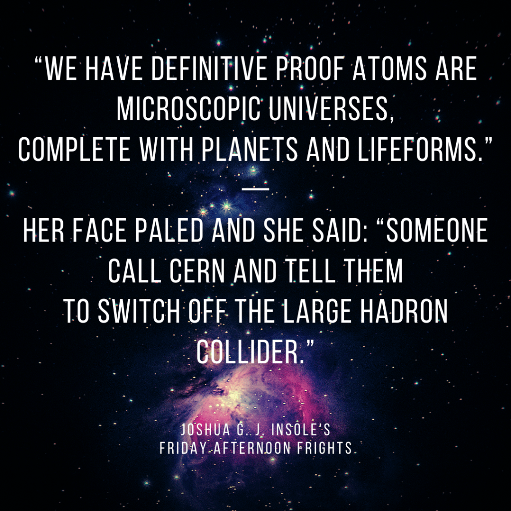 Every Friday afternoon, I’ll write a two-sentence comedy/horror story, based on a randomly generated word. This week’s word is particle!