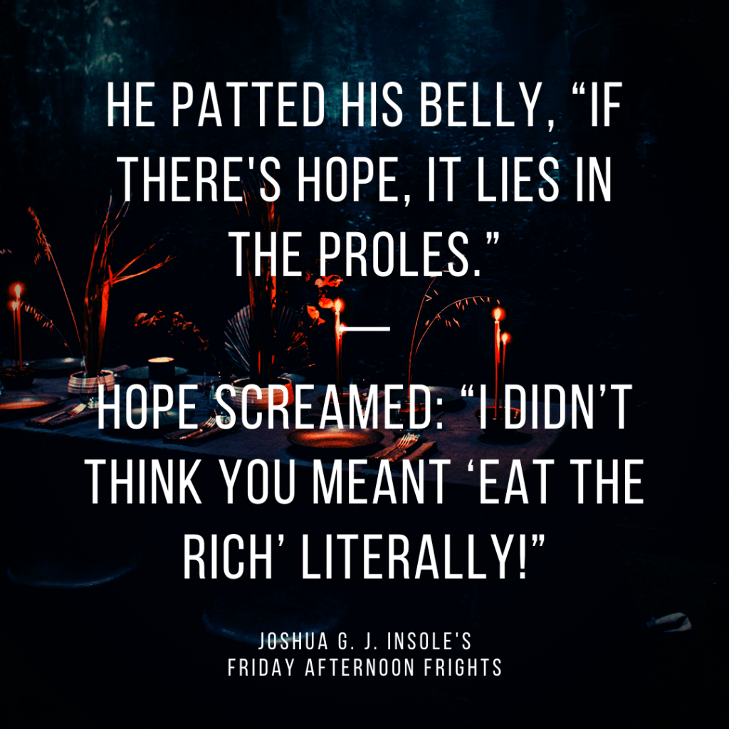 Every Friday afternoon, I’ll write a two-sentence comedy/horror story, based on a randomly generated word. This week’s word is banquet!