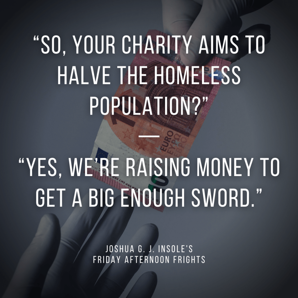 Every Friday afternoon, I’ll write a two-sentence comedy/horror story, based on a randomly generated word. This week’s word is charity!
