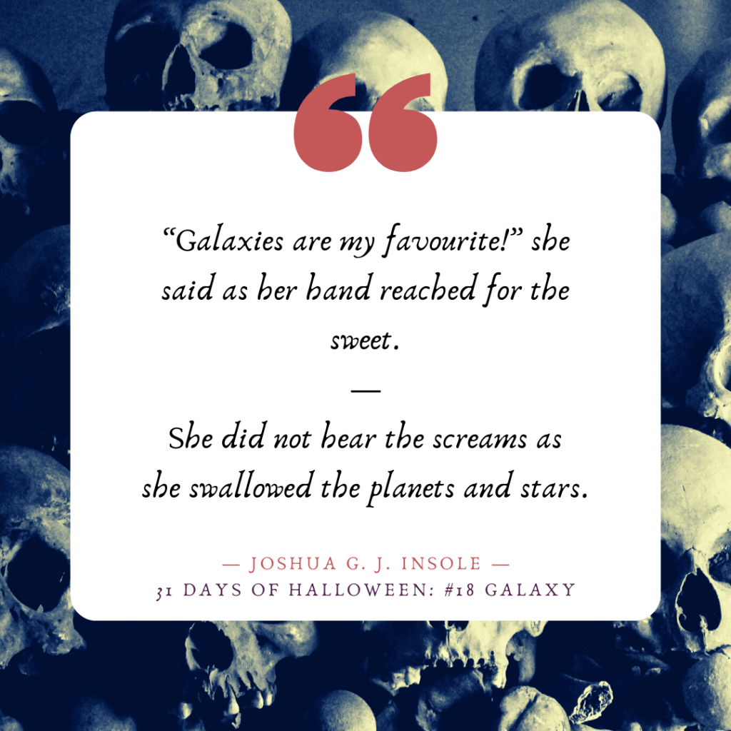 Just for Halloween, Bite-Sized Horror is now a daily event! Two-sentence shockers based on a random prompt, every afternoon! Today’s word is galaxy.